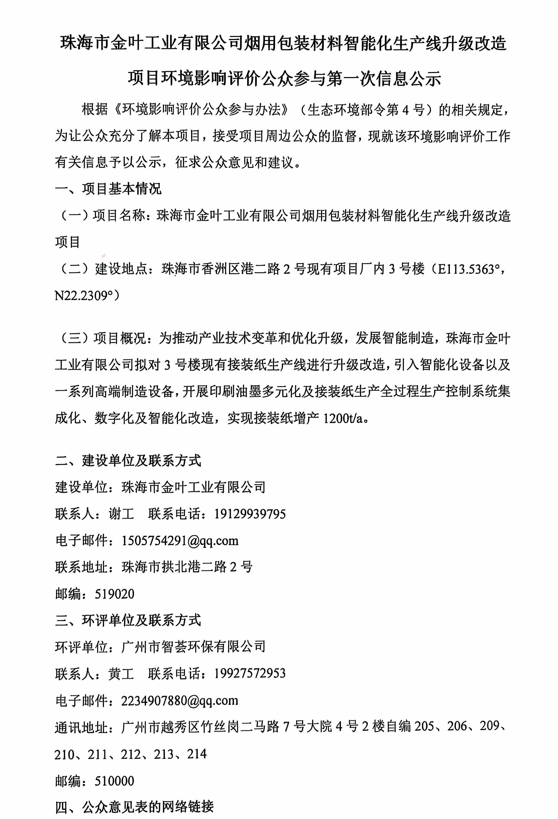 根据《中华人民共和国环境影响评价法》、《环境影响评价公众参与办法》(生态环境部令第4号)等相关规定,现对珠海市金叶工业有限公司烟用包装材料智能化生产线升级改造项目环境影响评价信息征求意见稿公示。项目概况及主要环境影响本项目对位于珠海市香洲区港二路2号现有项目厂内的3号楼(E113.5363°,N22.2309°)现有接装纸生产线进行升级改造,引入智能化设备以及一系列高端制造设备,开展印刷油墨多元化及接装纸生产全过程生产控制系统集成化、数字化及智能化改造,实现接装纸增产1200ta